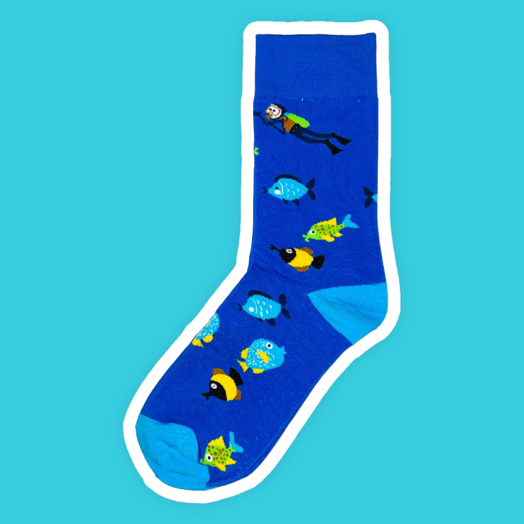 Dive into our Underwater Adventure Sock Collection! These socks feature an exciting design of a scuba diver exploring the depths of the ocean, surrounded by colorful fish. Whether you're a fan of marine life or simply seeking a fun and unique addition to your sock drawer, our Underwater Adventure Socks are a perfect fit. Immerse yourself in comfort and style with these captivating and comfortable socks that bring the ocean to your feet